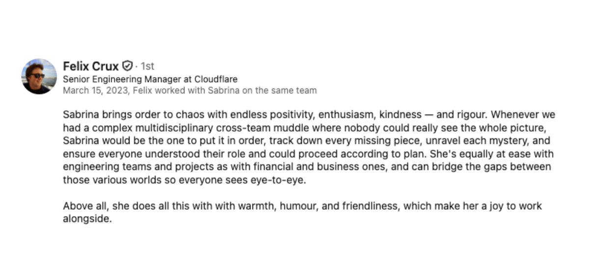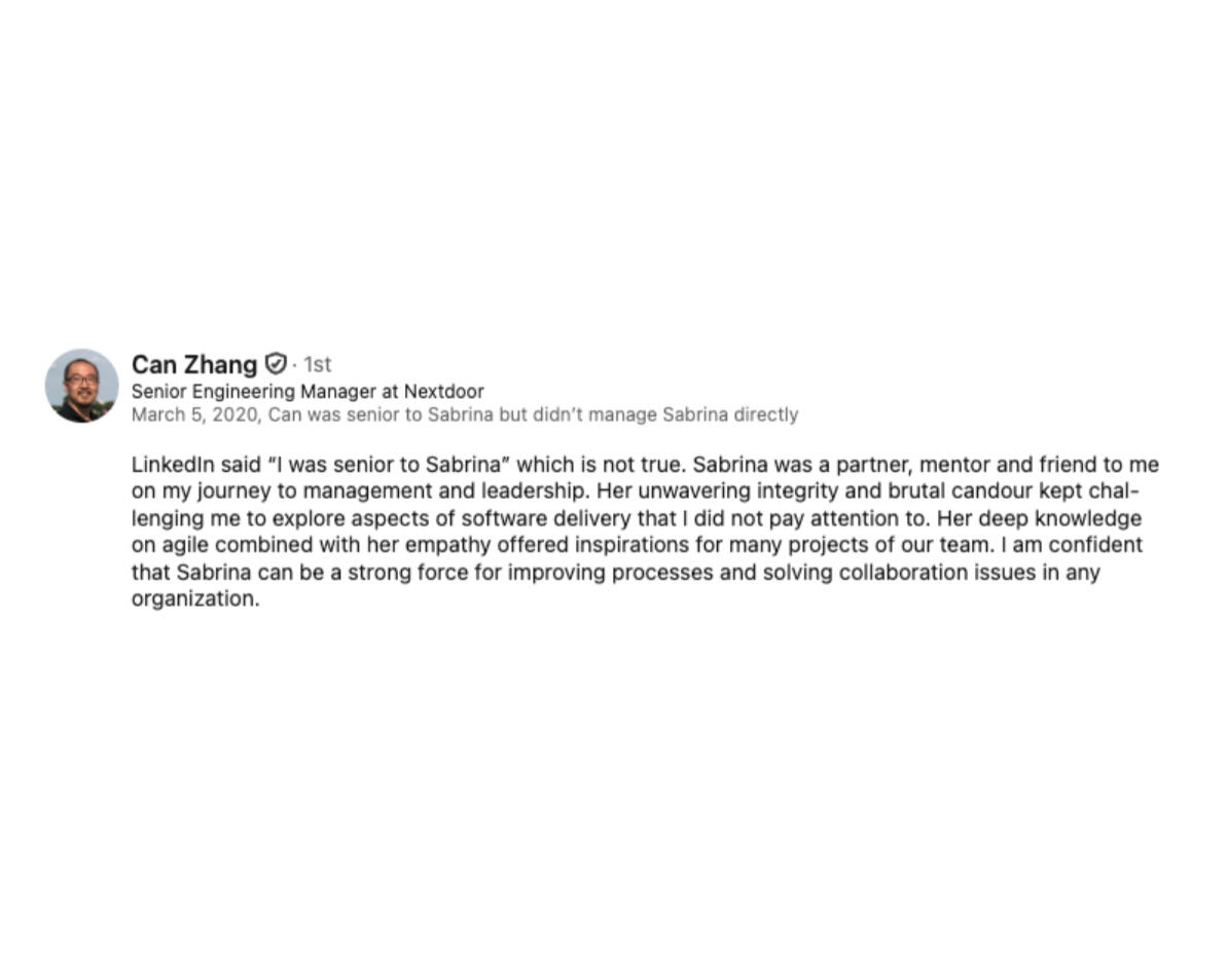 Sabrina is a strong communicator and negotiator driven to help teams deliver. I saw her shine when she graciously stepped in to help my team get to delivery on a high-profile project which lacked resourcesSabrina’s dedication to our team was essential as she extended a high level of support, organization and clarity to get us to the finish line. She worked hard to remove roadblocks in my team’s way, and kept us equally motivated to deliver with excellence.I was lucky to have worked with Sabrina and believe her unique talents in management will reward everyone with success- Amy Mamtura